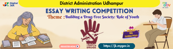 The District Administration Udhampur invites students, youth, and citizens to participate in the Nasha Mukt Udhampur Essay Writing Competition. The competition aims to encourage participants to express their views on drug abuse and contribute ideas for building a drug-free society.